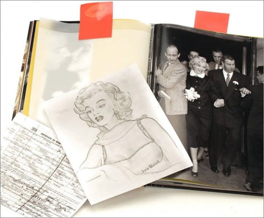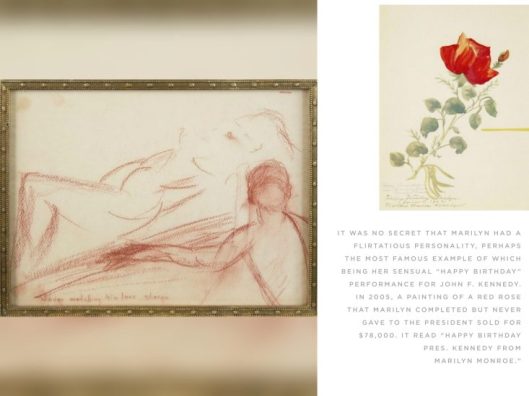 A delicate watercolour of a red rose, supposedly painted by Marilyn and inscribed to President Kennedy, is a lovely addition. However it looks nothing like her other personal sketches, which were abstract and impressionistic, and some fans have questioned its authenticity. It was sold for $78,000 at Julien’s Auctions in 2005, with a label on the verso from the 1999 Christie’s sale of Marilyn’s personal property – but the inscription to JFK is written below an earlier dedication to MM, suggesting that the ‘rose painting’ was a merely a gift she received that was subsequently altered.