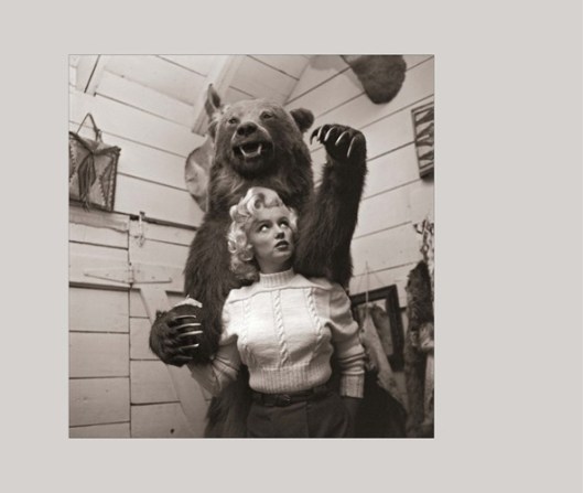 More props, and more contrivances were added. Marilyn poses in the arms of a stuffed bear, looking up fearfully. This corny premise is realised because she appears so truly helpless, and yet there’s a twinkle in her eye. She mirrors the stiff posture of a Canadian Mounted Policeman, then giggles as she pins a badge on his shirt.