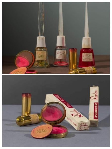 American cosmetics manufacturers were expanding their reach, and among Frida’s possessions were several well-used powder compacts (she was gifted with a large supply after representatives for Helena Rubinstein visited Mexico), eyebrow pencils and lipsticks, usually red (such as Revlon’s ‘Everything’s Rosy’), signing off letters with lipstick kisses. However, she also used make-up in ways that subverted the feminine ideal and emphasised her androgynous side, adding thick black strokes to her eyebrows and upper-lip hair. This became part of her signature look and still has the capacity to shock. Some of Kahlo’s greatest works, like Self-Portrait With Monkeys (1943) are painted with a surgical precision which belies her naïve art influences, and she transformed herself with the same dedication.