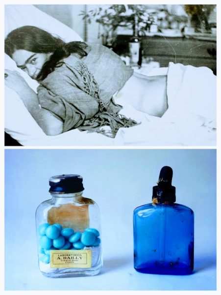 With her vision at its peak, Frida’s world was shrinking. Deteriorating health kept her mostly confined to home, or in hospital. Depressed by the failure of successive operations to improve her condition, Frida drank heavily and was probably addicted to morphine and barbiturates, among the many medications she was prescribed. Bottles and jars are displayed in one case, including herbal remedies, tablets and solutions, ampules, and other paraphernalia.