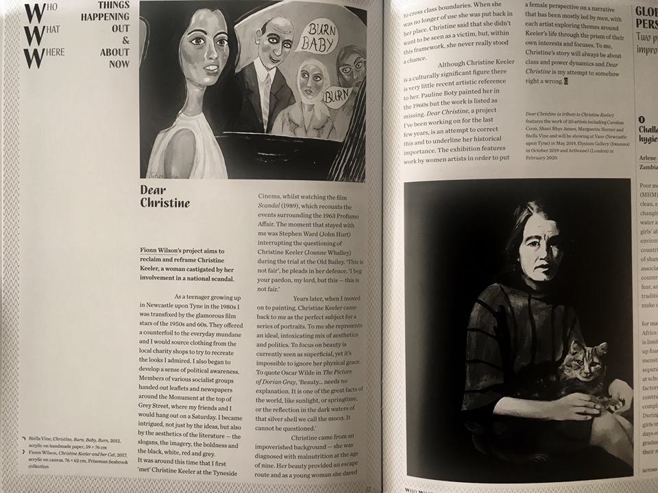 Dear Christine (a tribute to Christine Keeler) will be touring from 2019-2020 to Vane Gallery (Newcastle), Elysium Gallery (Swansea) and Arthouse1 (London) and includes sculpture, painting, poetry, music, film, photography (previously unseen images of Christine) and a performance piece and writing and involves twenty amazing artists. It’s not just about me by a long shot. The contributors are: Natalie d’Arbeloff, Katie Chatters, Caroline Coon, Catherine Edmunds, Roxana Halls, Penelope Hayes, Sadie Hennessy, Marguerite Horner, Barbara Howey, Shani Rhys James, Sally Jones, Jo Wonder Woodward, Sadie Lee, Cathy Lomax, Julia Maddison, Sonja Benskin Mesher, Wendy Nelson, Sarah Shaw and Stella Vine. With writing from Lucy Bernadette Cox, Tara Hanks, Julie Raven (Julie Burchill), Tanya Gold, Cathy Lomax, Caroline Coon and Bo Gorzelak Pedersen.