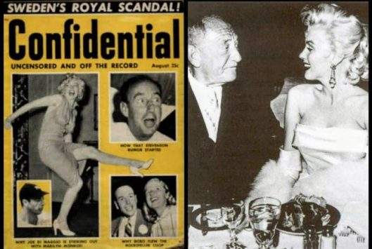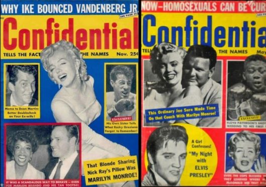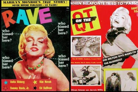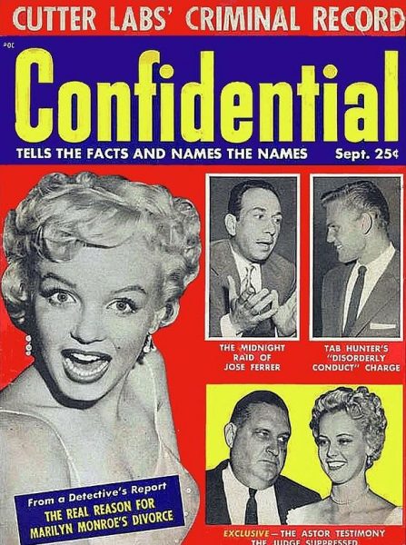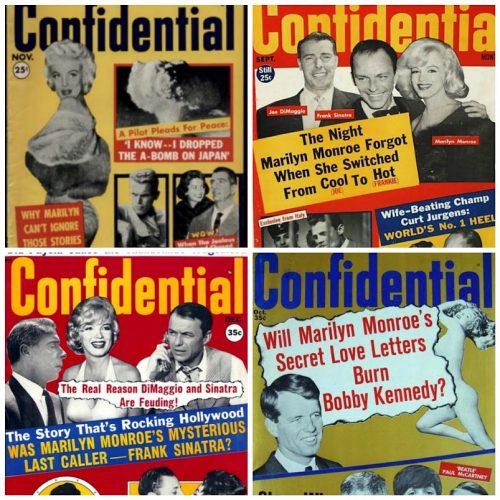 Confidential remained in print until 1978, albeit in a much tamer vein. In the early 1960s, their cover stories focused again on Marilyn Monroe’s relationships with DiMaggio and Sinatra. After her death the headlines persisted, even linking her to Bobby Kennedy. Meanwhile, fan magazines like Photoplay adopted its gossipy style, and in 1960, Elizabeth Taylor and her fourth husband, singer Eddie Fisher, would sue seven magazines over their lurid coverage of the ‘Liz-Eddie-Debbie’ scandal.