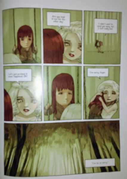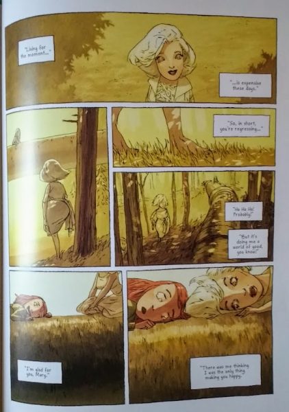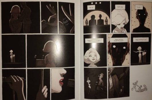 Marilyn appears on another TV talk-show, speaking loudly “as if to cover up the tiny voice that was murmuring inside of her,” and we recall the slightly eerie audio clips of Monroe’s last interview. A bereft Sugar, naively drawn, appears as the narrator concludes, “the worst thing about playing hide-and-seek is knowing there’s no one coming to find you.”