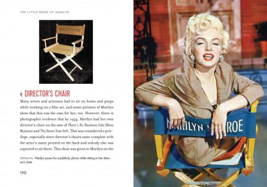 The Little Book of Marilyn begins with a biographical chapter, noting that while in early life she was often “sad and despondent,” Marilyn ultimately rose above her difficult childhood to become one of the world’s most successful women. “Marilyn’s star rose quickly,” Morgan writes, “thanks mainly to the fact that the public absolutely adored her, even in small roles.” She observes that Marilyn’s career brought her confidence, from starting out as a model to achieving fame in movies; and unlike some authors, she focuses less on Monroe’s love affairs and more on the independence she achieved as the defining thread in her life’s arc.