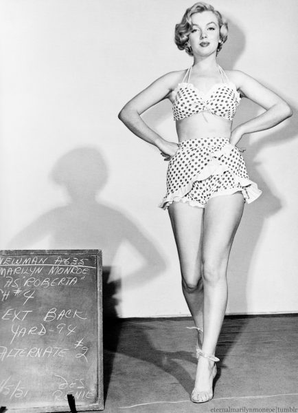 In her days as a pin-up model, Marilyn posed in countless bathing suits; a typical two-piece would consist of high-waist shorts and a bra top, although she would sometimes experiment with ruffles or polka dots. Her most daring bikini was olive-green, with a strapless top tied in the middle with string, and low-waisted bottoms with string at the sides. She also wore one-pieces in bold colours, such as can be found today on the official site of Marilyn’s contemporary, ‘bathing beauty’ Esther Williams.