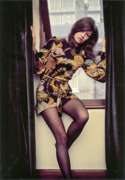 James Birch, the art dealer who curated the 2010 exhibition, Christine Keeler: My Life in Pictures, contributes three unseen photographs. Two were taken during the 1960s, and are a study in contrasts. The first, in black and white, shows Christine looking over her bare shoulder with an unassuming smile; while in the second, she sits by a curtained window wearing an ornate mini-dress and black tights, her left eye obscured by long dark hair. In the third photo, probably taken in the early 1980s, she is modestly dressed with minimal makeup, and is holding a sheet of paper.