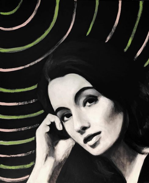Fionn Wilson has used another image from this series, where Keeler sits on her bed with a beloved tabby cat on her lap. Painted in black and white like the photograph, ‘Christine Keeler With Her Cat’ aligns the stripes on her dress with her feline companion’s fur. The original caption described Christine as ‘the mistress of John Profumo,’ but here the cat “acts almost as an advocate, daring us to make any more judgments of her.”