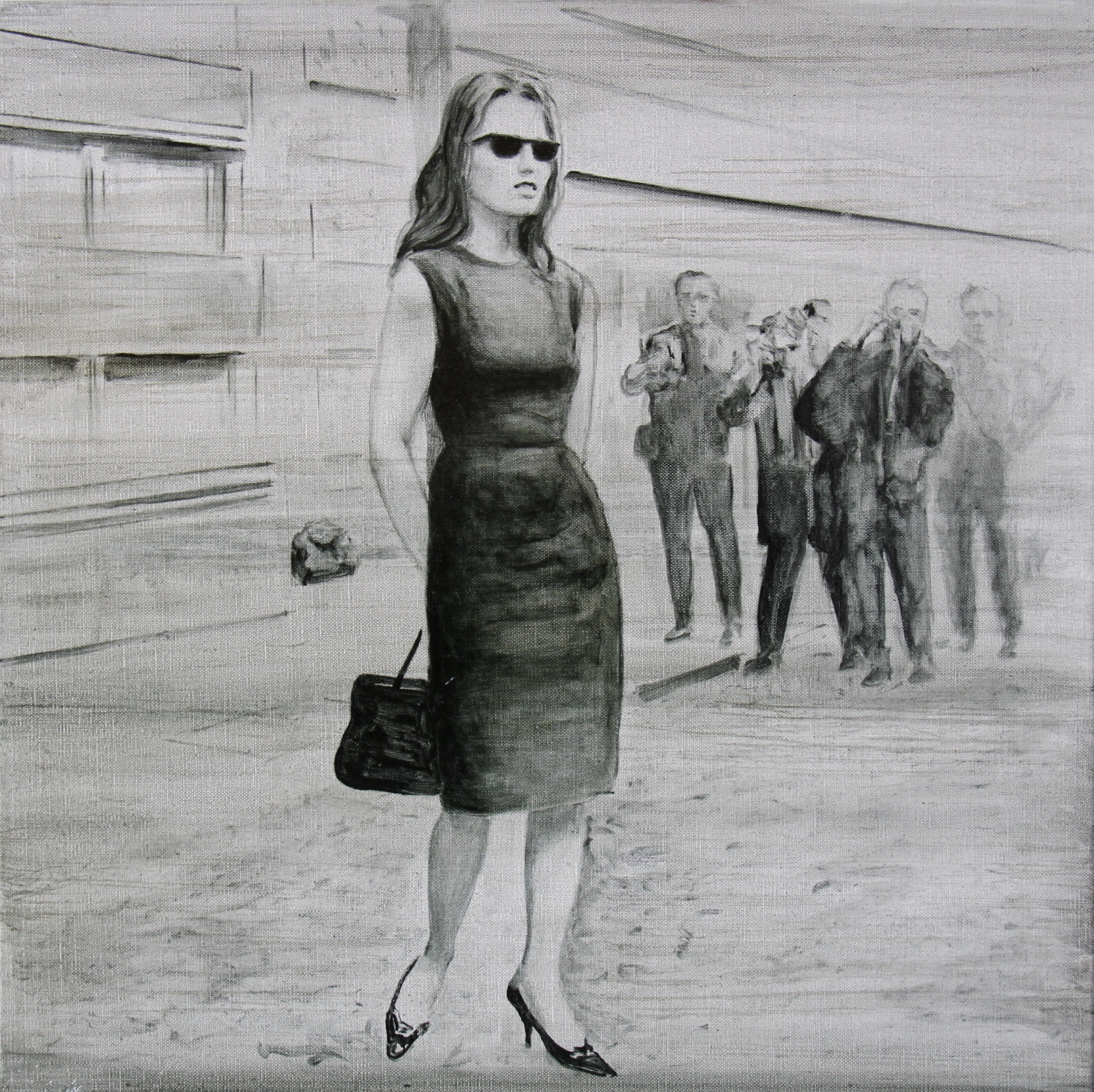 Marguerite Horner charts Keeler’s progression from sinner to martyr in three oil paintings, all rendered in newsprint greys. ‘Police’ is based on newsreel footage of her crowded by uniformed officers, with film star sunglasses shielding her from the flashbulbs of waiting reporters. ‘Paparazzi’ finds her at the trial of Stephen Ward, brushing hair from her face, while the final image shows her standing defiantly before the press. Its title, ‘Casting the First Stone,’ refers to the New Testament story in which Jesus defends an adulteress. “The culture of the Swinging Sixties which followed the Profumo Affair had a glamorous ring to it,” Horner writes, “but sometimes it disguised what often runs contrary to what should be our fundamental aim in life, which is to ‘Love one another’—not use one another.”
