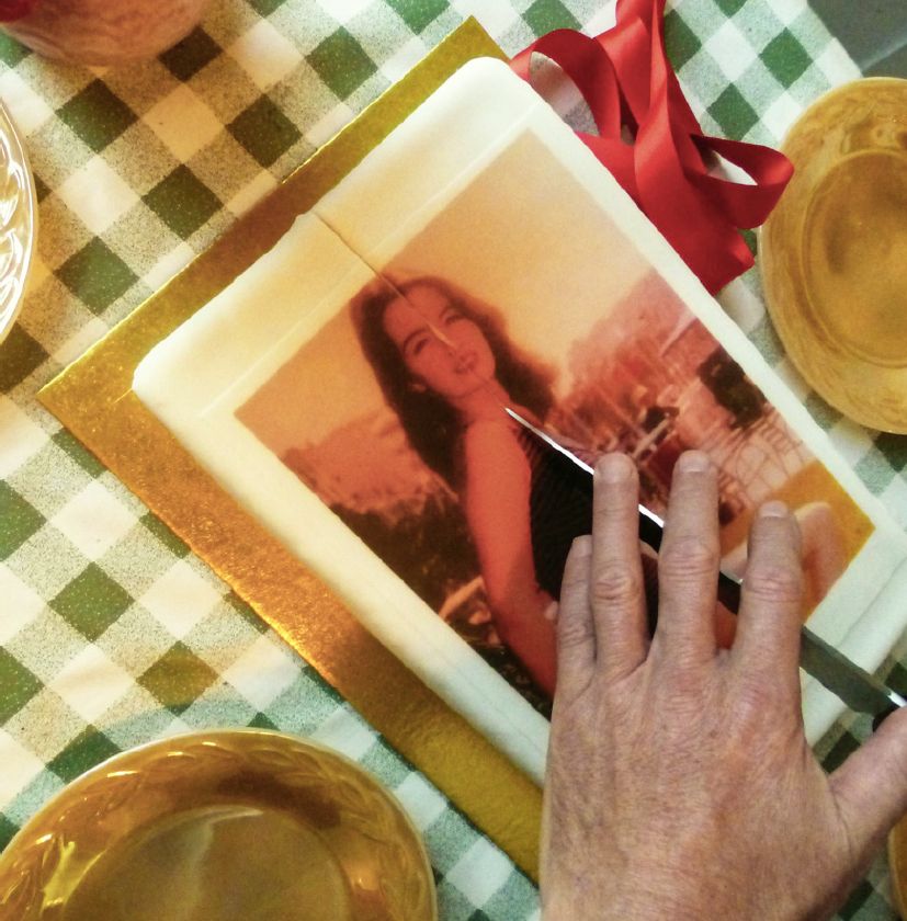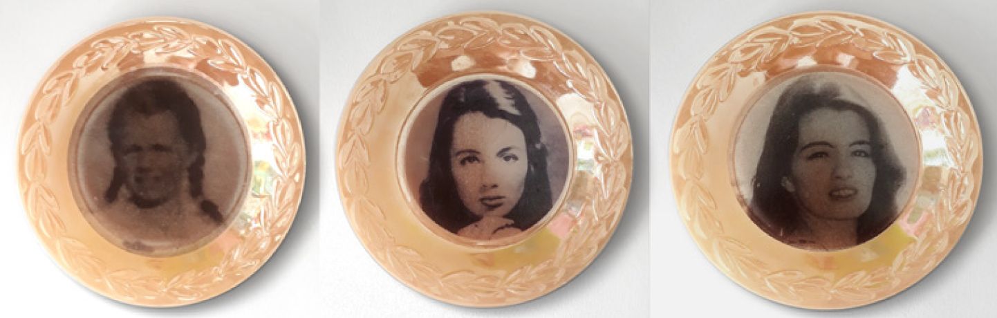 Stella Vine’s 2012 painting, ‘Christine, burn, baby, burn,’ is also inspired by press photos from her court appearances, exuding startled dignity as vampiric gawkers peer through the window of her car, mouthing curses. Keeler’s scapegoating is chronicled in Sadie Hennessy’s ‘Synecdoche (Christine Keeler Cake’), comprising twelve Polaroid images of Christine on a cake, sliced in half on top of a gingham tablecloth. This is accompanied by a written monologue from a gossipy woman in an English tearoom, ending with a line paraphrased from T.S. Eliot’s The Love Song of Alfred J. Prufrock: “In the room the women come and go, talking of John Profumo.” Hennessy expands the domestic theme with a series of plates showing further images of Christine, collectively named ‘Peach Lustre’.