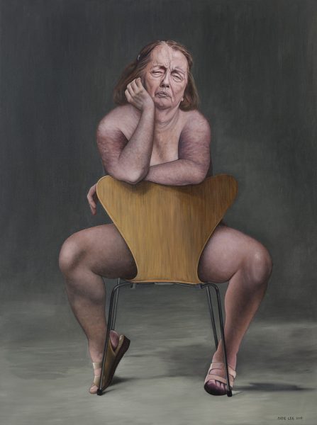 Lucy Cox takes a geometric approach, focusing on the chair itself with its sharp angles, and how it “shields yet reflects Christine’s body. The wood is hard and unyielding, in contrast to the softness of the flesh behind …” Although the sitter is absent, her form is replicated in the chair.