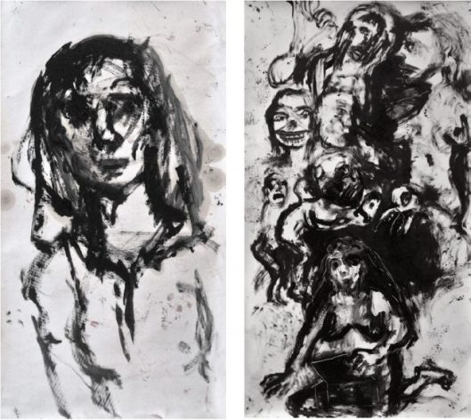 In ‘Pandora’s iPad,’ Shani Rhys James transposes Greek mythology to the social media age. Christine sits on her chair at the foot of this metre-long, rectangular painting, while a host of ghoulish faces crowd over her. In the accompanying work, ‘Christine,’ she is alone and bewildered. Black, smudged oils evoke the nightmarish tone of Francisco Goya’s witch paintings. “With its power to disseminate false information,” Shani comments, “the iPad might be said to have the potential of a modern-day Pandora’s Box.”