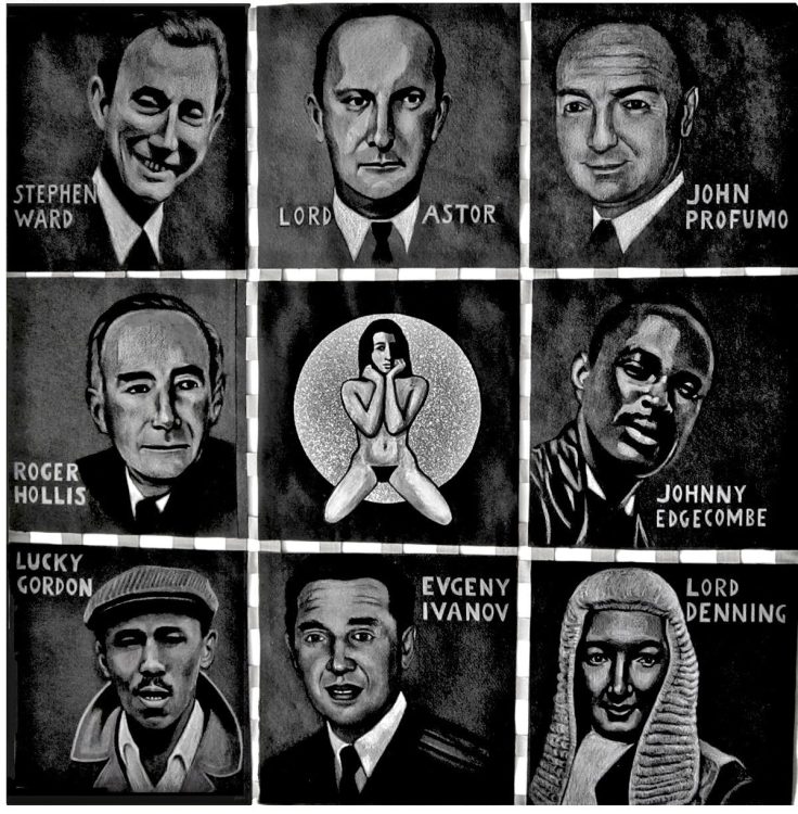 In 1964, a docudrama known as The Keeler Affair was released in Europe (though banned in the U.K.) Christine’s screen test, with her flipping through a magazine on a sofa, was used as an introduction. She had initially hoped to star, but was denied membership by the actors’ union, Equity, and the role was played by actress Yvonne Buckingham. In her essay about The Keeler Affair, Cathy Lomax opines that Buckingham “actually makes a more believable Keeler than Keeler herself whose looks are strangely off-kilter, with the proportions of her face somehow disconcertingly odd.” The finished product, an exploitation movie with new-wave pretensions, fell short of producer Nicholas Luard’s description as “the British La Dolce Vita.” Lomax, who is studying for a PhD in Film Studies, has painted black-and-white panels depicting scenes from The Keeler Affair, with the title overlaid in red.