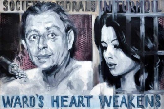 Sal Jones mines tabloid tropes with two oil paintings. The first evokes the Fleet Street’s bloodthirsty ‘red-tops,’ collating images of a forthright Keeler with red-hot headlines. At the bottom, there’s a handwritten quote from Christine herself which gives us the title: ‘I Took on the Sins of a Generation.’ The second pairs a frail Stephen Ward with a downcast Keeler, flanked by two headlines: ‘Society’s Morals in Turmoil,’ and ‘Ward’s Heart Weakens’ (this painting’s title.) Referencing his suicide, it subverts the first headline’s censorious tone, implying that society’s moral turmoil is not confined to the two protagonists.