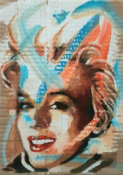 I really liked the way Noah had used complimentary colours of blue and orange in large energetic sweeps in the background against white and the raw cardboard. I wanted to keep as much of that visible as possible, so that the foreground and background merge. The parts I added I have kept to a more tonal range, bringing some of that bright orange into the lips. I hope you are happy with the result Noah, good luck with the exhibition and fundraising. In the photos on your Instagram page you are always smiling which gave me the idea for the subject. Who doesn’t love a Marilyn Monroe smile?