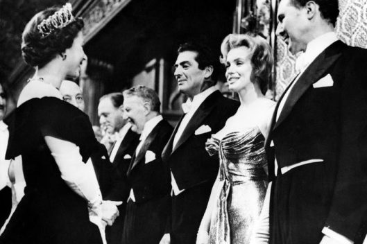 Flanked by actors Victor Mature and Anthony Quayle, she was beset by stage fright, but her brief introduction to Queen Elizabeth II was captured on front pages nationwide. Much to her surprise, Marilyn learned from the Queen that they were ‘neighbours’ at Windsor Park. “The Queen is very warm-hearted,” she said afterwards. “She radiates sweetness.” She was also introduced to the Queen’s younger sister, Princess Margaret, and urged her to go see A View From the Bridge (which Margaret did a few days later.)