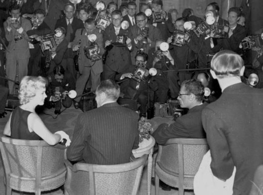 On the eve of her arrival, the publicity team assembled on Marilyn’s behalf met with members of the Ministry of Civil Aviation and London Airport officials, who scoffed at concerns for her safety. Nonetheless, on July 12th, the airport was teeming with fans, journalists and photographers. The situation quickly spun out of control, with extra police being called in to restore order. Amid the chaos Marilyn held her nerve, fielding questions from behind the airport’s snack-bar. Although irritated by her insistence on not speaking into a microphone, the press were quickly disarmed by her unassuming wit. Over the following days she entertained reporters at the Savoy Hotel, proving herself a cannier media operator than either her serious-minded husband, or the guarded, patrician Olivier.