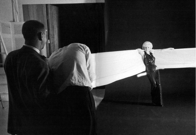 She disappeared into a changing room with two female assistants while Kirkland “nervously” checked his equipment, wondering which Sinatra song he should play (‘Nice and Easy’ or ‘Blues in the Night’) and how to tell her that he wanted to try an additional picture that hadn’t been discussed. As she reappeared, he poured her a glass of champagne. “I had come up with the idea of also photographing Marilyn with a very long piece of white cloth,” he explained. “She might be able to lean into it as it was stretched out, or perhaps wrap herself in it. My ideas weren’t totally clear, even to me, but I felt that this prop would allow room for her creativity. I would learn an important lesson here that evening: Always have your ideas clearly defined – or at least look as if you do – when you present them to a star.”