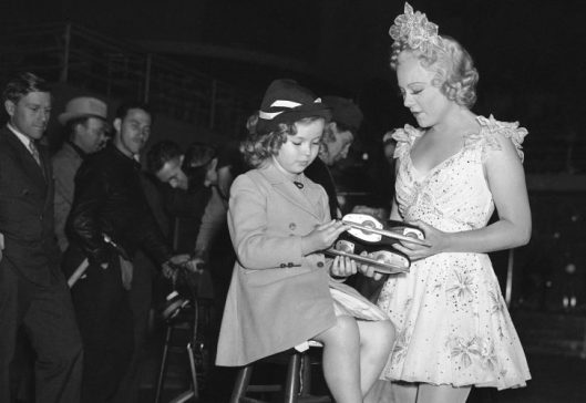 The first Fox blondes: Sonja Henie presents Shirley Temple with a pair of ice skates