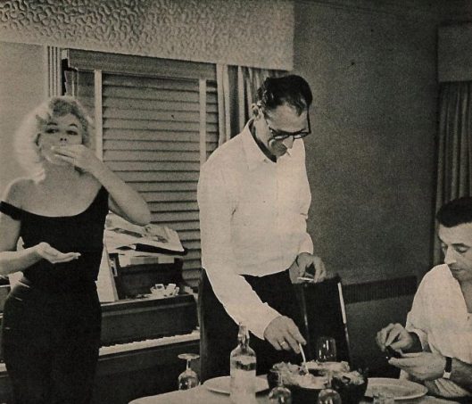 On a break from filming Let’s Make Love, Marilyn was holding an informal dinner party for herself, husband Arthur Miller, co-star — and soon-to-be lover — Yves Montand, and his actress wife, Simone Signoret (to whom Boty has also been compared.) All four were then living in neighbouring bungalows at the Beverly Hills Hotel. In Davidson’s candid image, Monroe continues eating as she walks away from the table, unconcerned by the strap falling off her little black dress.