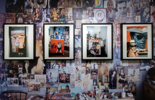 In this installation at Gazelli Art House, we see framed images of Pauline posing with some of her paintings mounted onto a giant reproduction of the wall montage from her London home, featuring two photos of Marilyn by Richard Avedon (cut out from copies of Life) and another by Eve Arnold (from the Sunday Times magazine.)