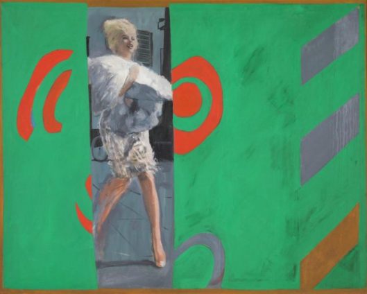 Nonetheless, Marilyn — or Sugar Kane, her character — is in motion, accentuated by Boty’s red curves, with slanted blue lines in the corner pointing, perhaps, to an uncertain future.