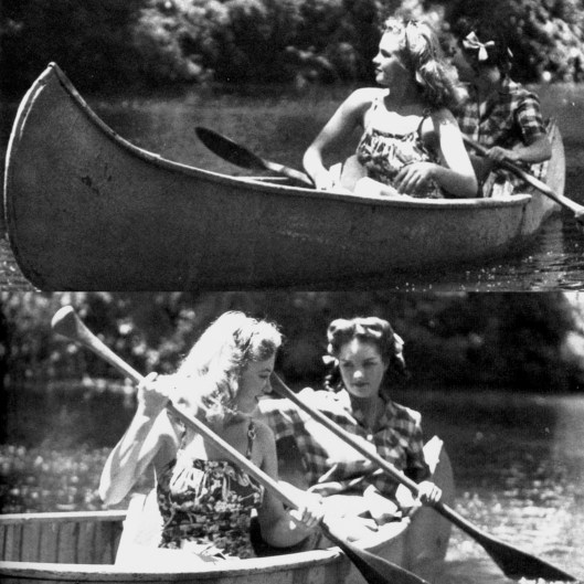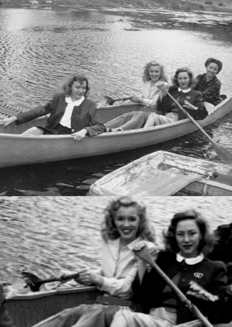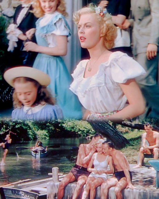 Marilyn had just one line in the movie. Wearing a blue pinafore over a white blouse, she appears as part of a congregation leaving church. ‘Hi, Rad!’ she says, smiling, and a slightly distracted June Haver replies, ‘Oh, hi Betty.’ Her screen-time is less than two seconds. She also filmed a second scene, in which Betty is seen rowing a boat on a lake with another friend, played by Colleen Townsend. Unfortunately, her part in this scene was cut, although the boat and its two occupants can still be glimpsed in the background.